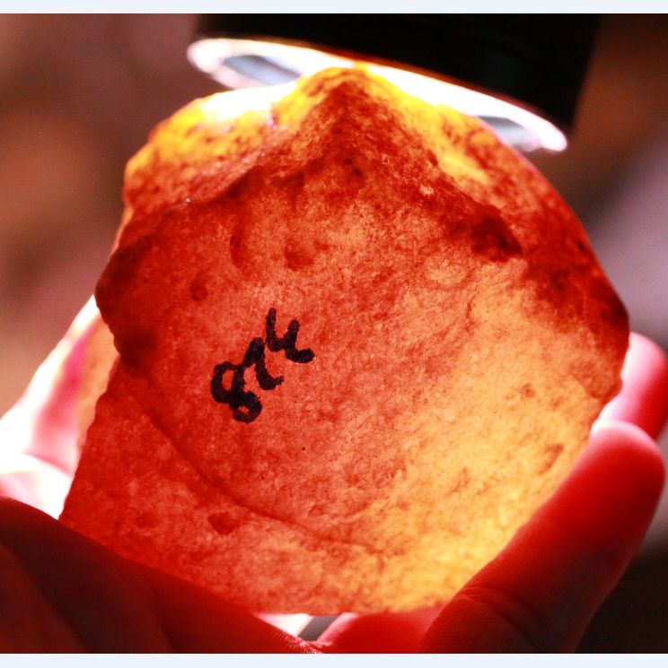 缅甸木那老坑红沙皮翡翠原石,翻砂坚硬扎手,不掉沙,全石脱沙点点路肉高黑度,侧边有碰口路肉发黑,实物比照片看起来路肉更黑种水更好!打灯通透电灯泡漂亮得不得了,有轻微的淡色紫罗兰色调,侧边有条短纹,其他整个主体完美无纹裂,超漂亮冰块一个,实物让人振奋不已太漂亮了,有冰种紫罗兰牌子位置,建议整体雕刻手把件,成品出货秒杀一片,外面成品十万以下的跟这个都没法比!祝君好运!!